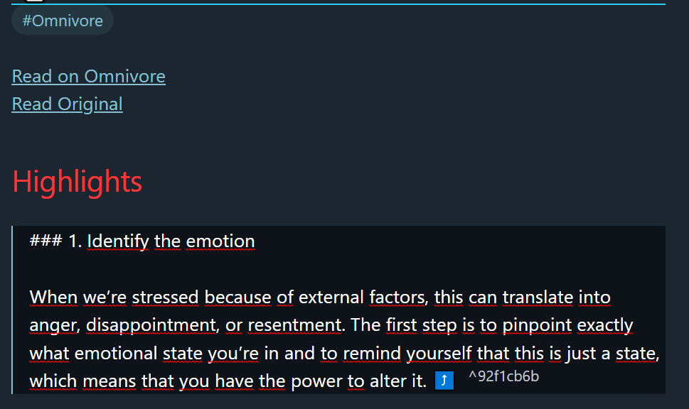 Sobald die Daten übertragen sind, wird in Obsidian eine neue Notiz angelegt, die mit einem Tag "Omnivore" versehen ist. Es wird sowohl automatisch der Link zum gespeicherten Artikel in Omnivore, als auch der Link auf die Orginal-Seite mit angegeben.
